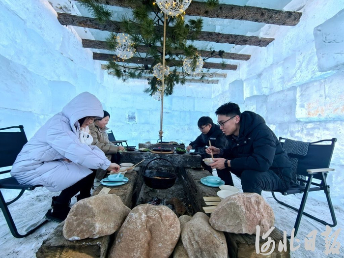 游客在隆化县热河谷温泉度假区冰屋内吃火锅。(河北日报资料片)