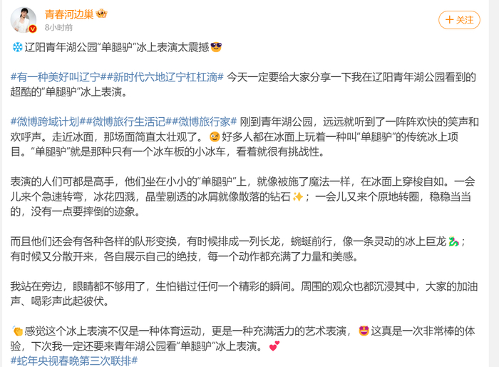 参访团成员们在游玩过程中,被“单腿驴”深深吸引、流连忘返,“感觉这个冰上表演不仅是一种体育动,更是一种充满活力的艺术表演,这真是一次非常棒的体验,下次我一定还要来青年湖公园看“单腿驴“冰上表演。”网络名人@青春河边巢感慨地说。
