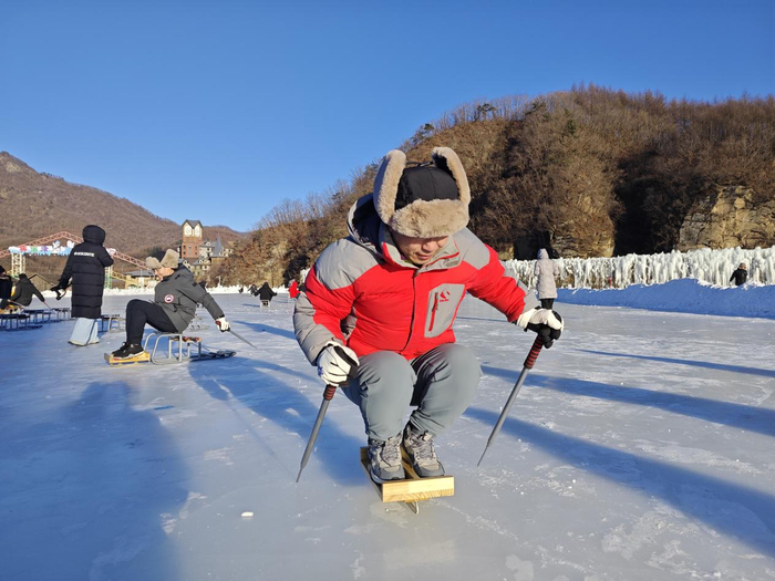 蹲上冰车、保持平衡、双钎撑地、滑行出发……几块木板和一个冰刀就组成了辽阳人的快乐时光。