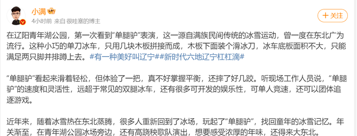 网络名人@钢小侠也表示,“近年来,随着冰雪热在东北蒸腾,很多人重新回到了冰场,玩起了“单腿驴”,找回童年的冰雪记忆。年关渐至,在青年湖公园冰场旁边,还有高跷秧歌队演出,想要感受浓厚的年味,还得来大东北。”