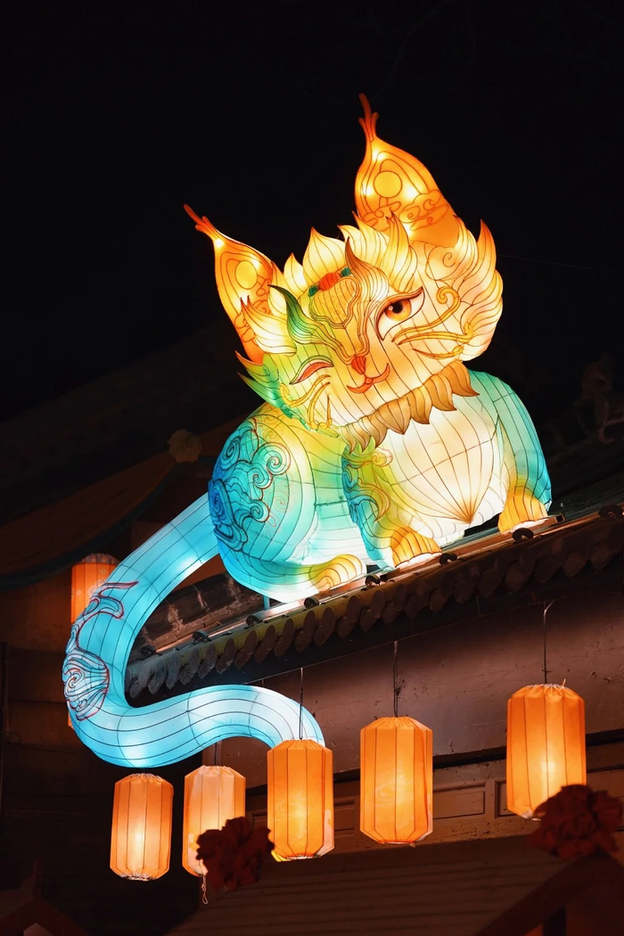 幻彩大狐狸匍匐在瓦片上,白素贞打着油纸伞站在屋顶,白色仙象仰天长啸、紫蛇腾云驾雾从湖面升起……这场灯会颠覆常规、颠覆想象,用创新的方式诠释传统,用传统的元素展现创新,传统又新潮,真的好City啊!
