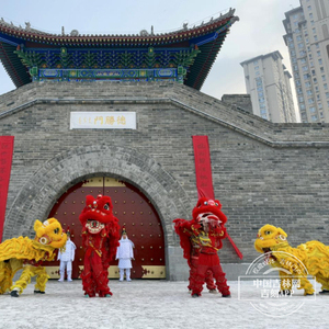 揭春联活动现场,锣鼓喧天,热闹非凡,秧歌表演欢腾起舞,舞狮献瑞灵动活泼,红火喜庆的迎新年氛围吸引众多市民、游客围聚在城门前。