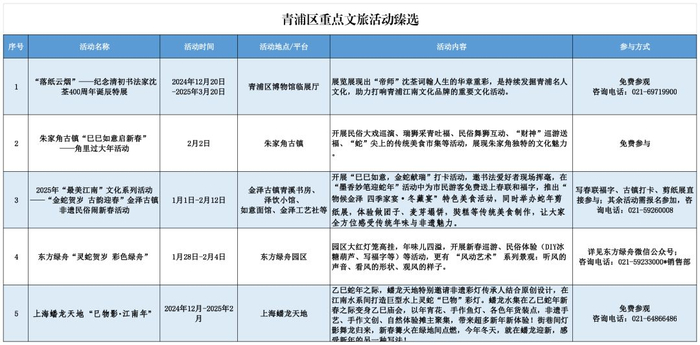 活动内容:开展民俗大戏巡演、瑞狮采青吐福、民俗舞狮互动、“财神”巡游送福、“蛇”尖上的传统美食市集等活动,展现朱家角独特的文化魅力。