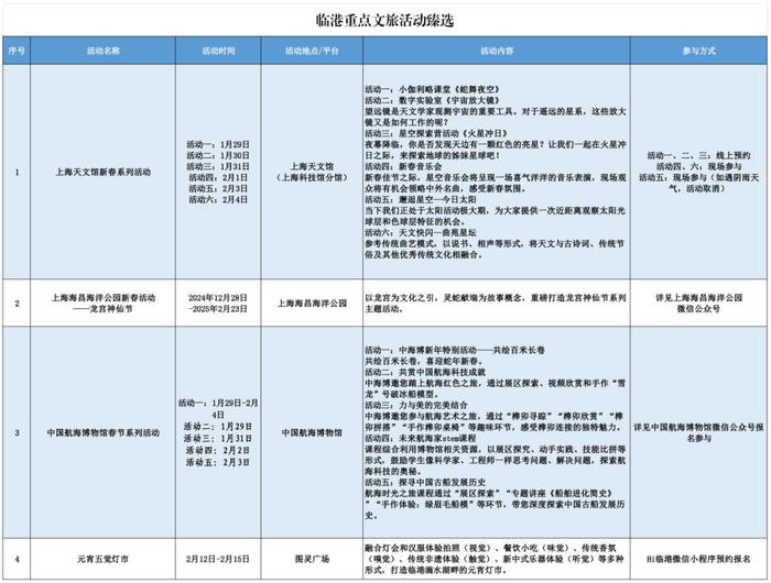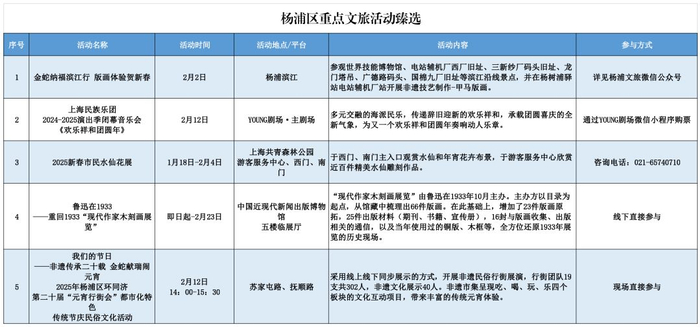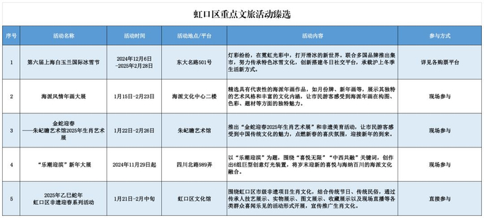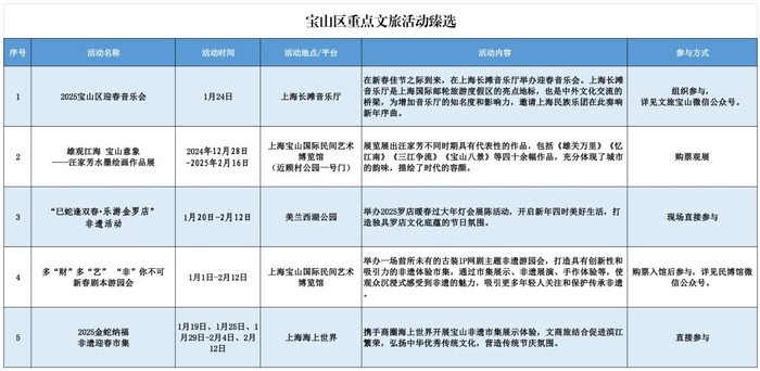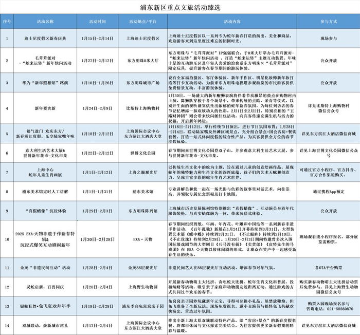 在新春佳节到来之际,上海将举办各类精彩丰富的文旅活动,欢迎海内外游客来上海,感受上海都市旅游的文化内涵,开启蛇年的美好生活。春节期间,本市将集中推出127项重点活动,详见: