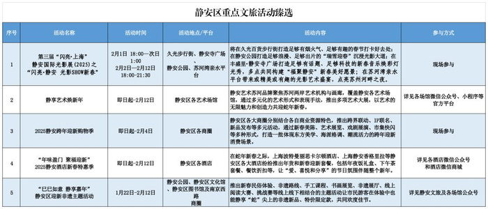 活动内容:将在久光百货步行街打造足够有烟火气、足够有趣的春节打卡好去处;在静安公园打造足够浪漫、足够出片的“瑞雪迎春”沉浸光影大道;在丰盛里·静安寺广场打造足够有话题、足够科技的新春音乐焕彩灯光秀,多点共同构建“福聚静安”新春美好愿景;在苏河湾亲水平台带来或精美或有趣的光影艺术盛宴,点亮苏州河畔之夜。