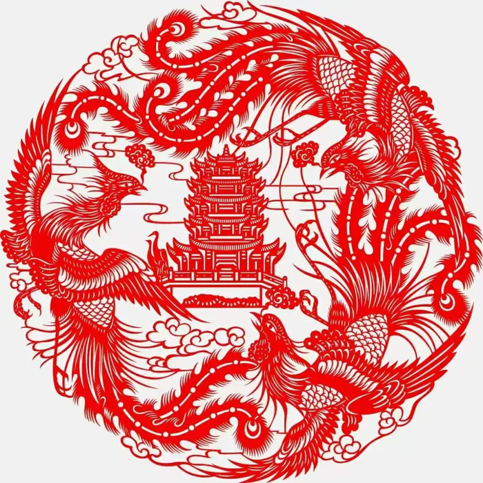 武汉剪纸省级非遗传承人沈松柏老师作品《楚凤名楼贺新春》。