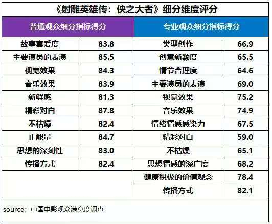 《射雕英雄传:侠之大者》以徐克美学重塑金庸经典,获得观众满意度82.9分,较徐克导演的上一部古装动作片《狄仁杰之四大天王》高1.3分。