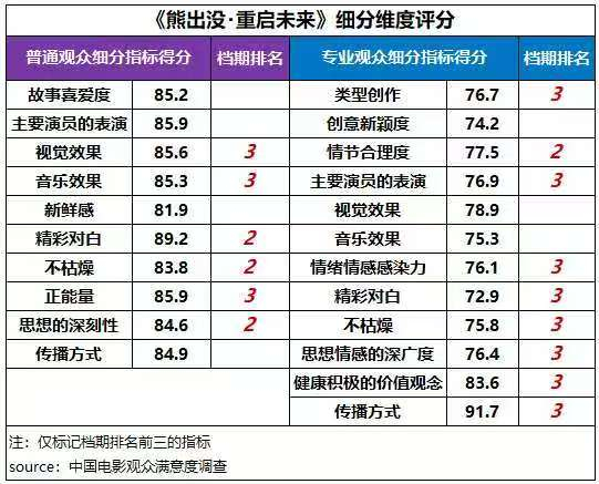 从细分维度来看,在普通观众评价中,《熊出没重启未来》的精彩对白、不枯燥和思想深刻性得分居档期第二位,视觉效果、音乐效果、正能量得分为档期第三位;在专业观众评价中,影片共有9项指标得分居档期前三位,其中情节合理度居第二位,健康积极的价值观念得分超83分。