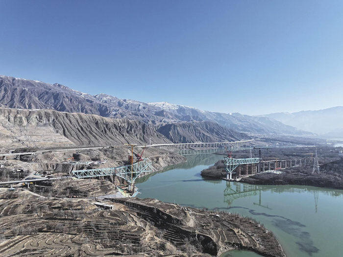 “川青铁路尖扎黄河特大桥主桥钢桁拱架设进度过半。”看着这一片热火朝天、有序建设的场景,川青铁路11标中铁大桥局项目党支部书记瞿小荃满怀信心地介绍起项目进度,“黄河北岸已经完成第14节间架设,南岸完成第12节间架设,主桥需要完成50个节间,目前共完成26个节间架设。”