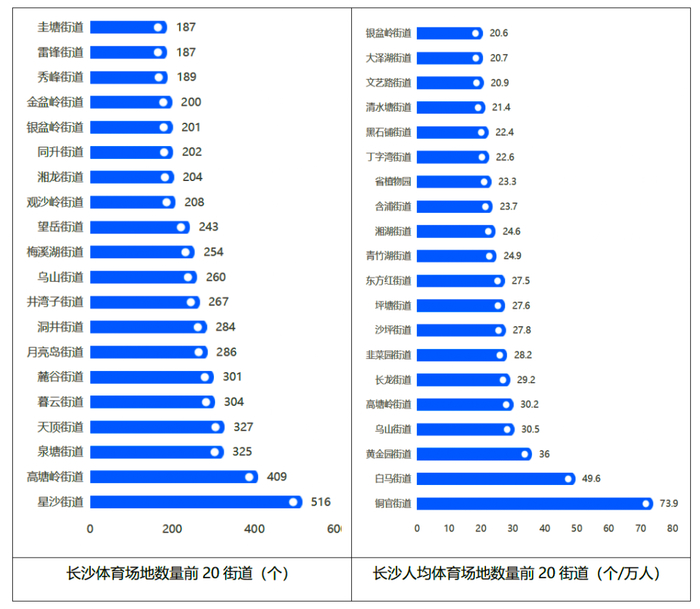 总的来说,长沙市中心体育场地扎堆,社区体育设施覆盖率达100%,长沙市育才学校、天泰馨园小区周边地段成全城顶流。但体育场地分布不均衡,主城区体育场地数量最多的街道为星沙街道,共计516处;万人场地数量最多的街道为铜官街道,达73.9个/万人。中心城区每万人平均场地数量明显低于城区外围组团,大型场馆及足球场地较少。