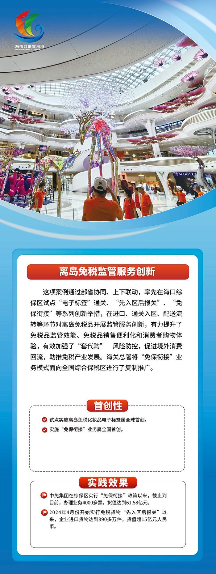 这项案例通过部省协同、上下联动,率先在海口综保区试点“电子标签”通关、“先入区后报关”、“免保衔接”等系列创新举措,在进口、通关入区、配送流转等环节对离岛免税品开展监管服务创新,有力提升了免税品监管效能、免税品销售便利化和消费者购物体验,有效加强了“套代购”风险防控,促进境外消费回流,助推免税产业发展。海关总署将“免保衔接”业务模式面向全国综合保税区进行了复制推广。