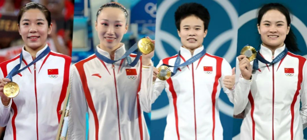 2024年巴黎奥运会,“体育湘军”共收获4枚金牌。从左至右依次为贾一凡(羽毛球)、张雅怡(花样游泳)、侯志慧(举重)、罗诗芳(举重)。图/新华网