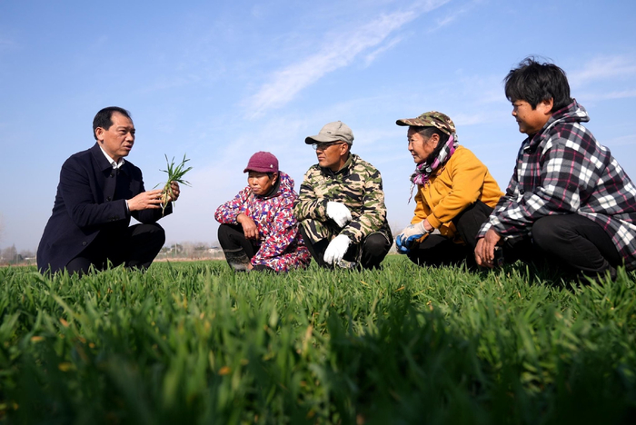 2月18日,枞阳县枞阳镇庆丰村,科技特派员何永忠(左一)在田间为农民进行小麦春管技术指导。眼下正值当地小麦返青最佳时节,枞阳县农业农村局组织农技人员走进田间地头开展“三服务”活动,指导农民科学施肥、春浇、打药等管护作业,确保小麦增产增收。