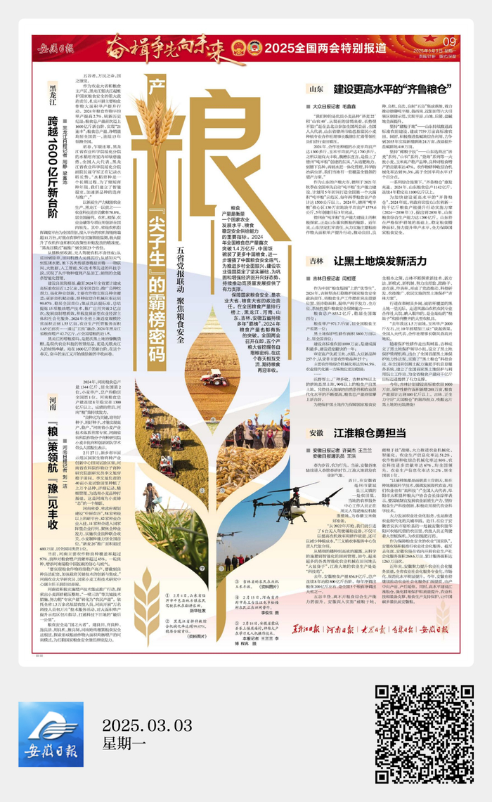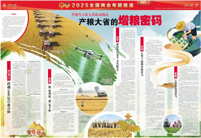 保障国家粮食安全,是农业大省、粮食大省的政治责任。在全国粮食产量排行榜上,黑龙江、河南、山东、吉林、安徽五省持续多年“霸榜”,2024年粮食产量也都有新的突破,为落实国家新一轮千亿斤粮食产能提升行动作出各自贡献。全国两会召开在即,五个产粮大省挖掘各自增粮密码,在这个春天相互交流,在2025年的秋季争取有更大的收获。
