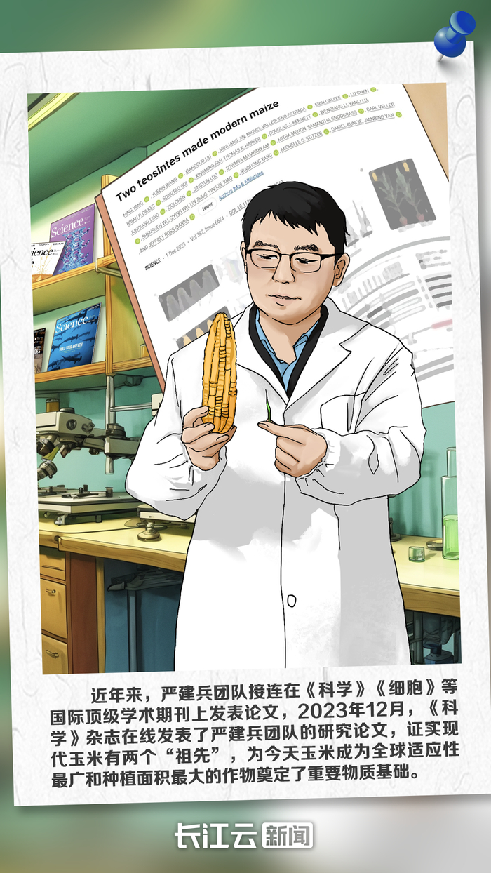 2023年12月,《科学》杂志在线发表了严建兵团队的研究论文。研究提出了一个全新的玉米起源模型,发现两份完全不同的大刍草,小颖大刍草亚种和墨西哥高原大刍草亚种为现代玉米的祖先,修正了玉米单一起源于小颖大刍草亚种的假说。研究为理解人为机制对作物驯化起源的影响提供了良好范例,并为利用野生资源进行作物遗传改良奠定重要理论基础。