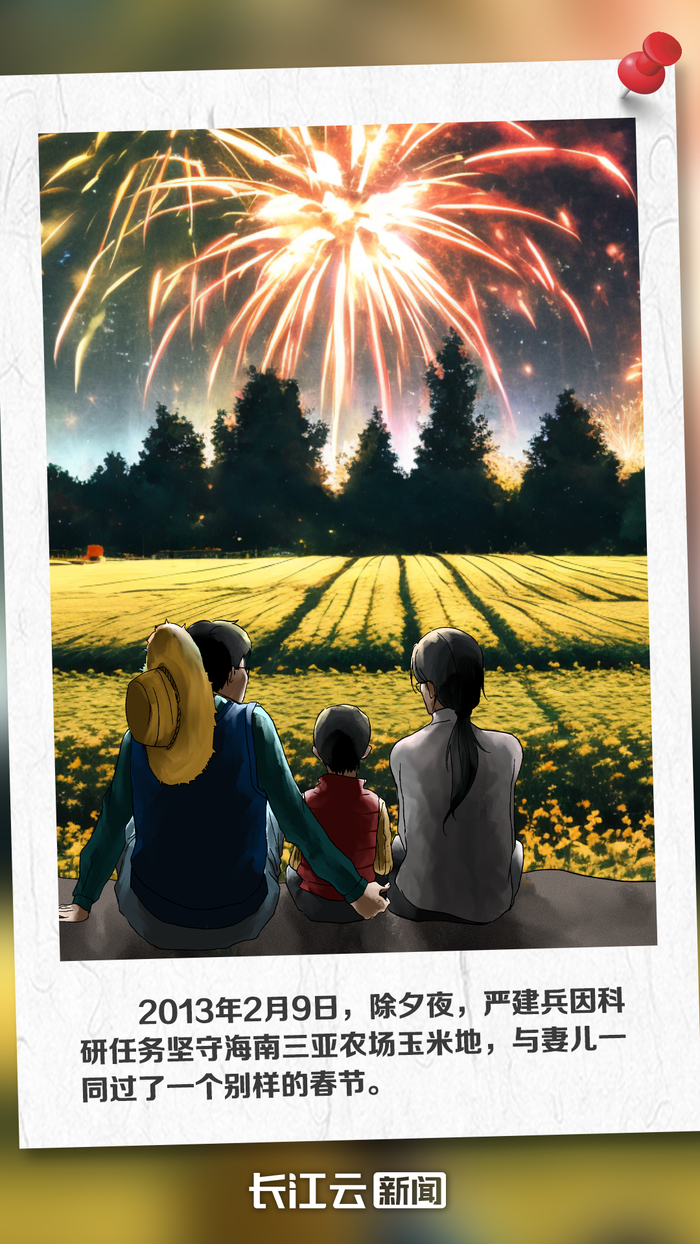 在严建兵的讲述中,他的团队中有位小伙子叫李文强,从研究生阶段开始,几乎每年都在海南国家南繁科研育种基地迎接新年的第一缕阳光。而严建兵本人,也是这样的坚守者,2013年除夕夜,因科研任务繁重,严建兵只能在海南省三亚市崖城镇南滨农场过春节。他给工人、研究人员放了假,自己坚守在基地,闲暇时和来到海南的家人晒太阳、煮玉米,晚上看着窗外的焰火在玉米地上空绽放。