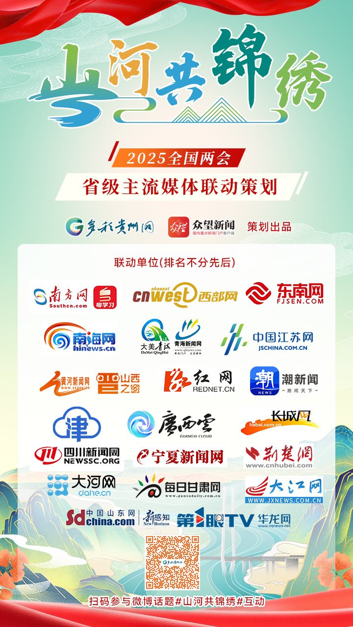 2025全国两会召开之际,从3月3日开始,多彩贵州网联合南方网、西部网、东南网、南海网、中国江苏网、青海新闻网、黄河新闻网、红网、潮新闻、津云、广西云、长城网、四川新闻网、宁夏新闻网、荆楚网、大河网、每日甘肃网、大江网、中国山东网、第1眼TV-华龙网共同推出“山河共锦绣”网络主题宣传活动。我们将沿着习近平总书记的足迹,穿越山河绵延,展现中国式现代化建设进程中物质文明和精神文明和谐发展的锦绣画卷。网媒携手齐联动,山海漫步破次元,跟总书记看“新质”好物,叹特色产业展新宏图。