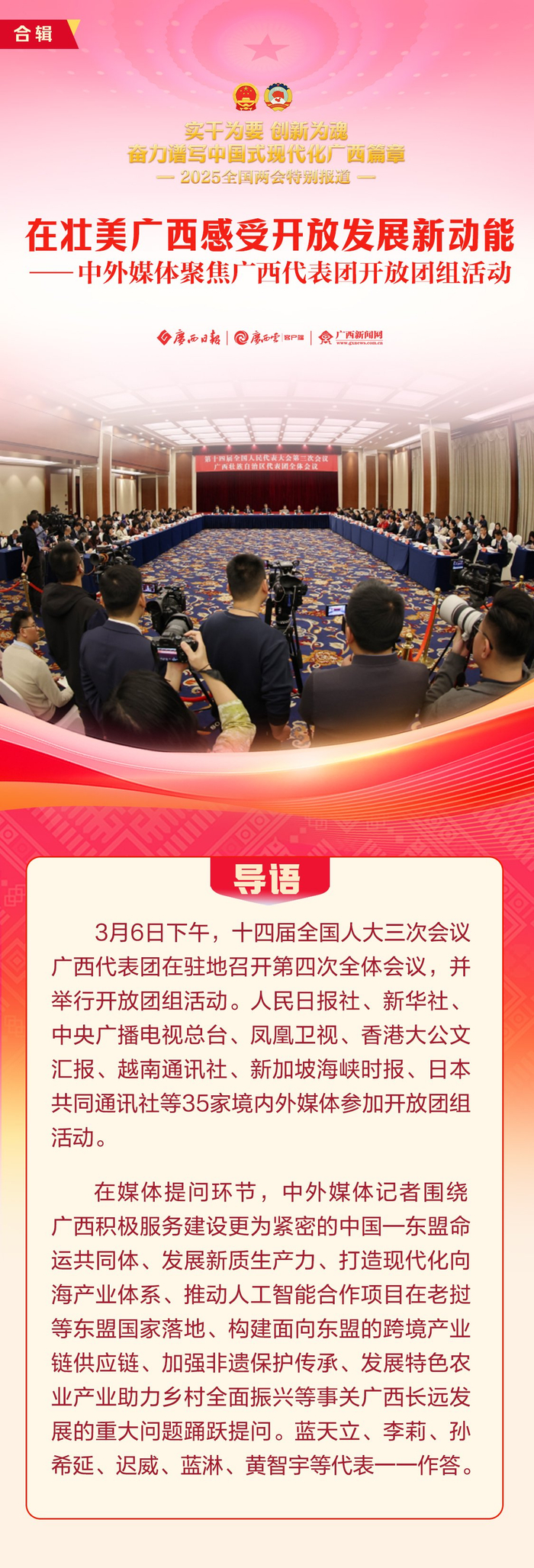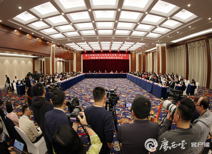 3月6日下午,十四届全国人大三次会议广西代表团在驻地举行开放团组活动。人民日报、新华社、中央广播电视总台、光明日报、经济日报、中国新闻社等中央主要新闻媒体,越南通讯社、越南人民报、越南电视台、凤凰卫视、香港大公文汇报等境内外媒体参加开放团组活动。