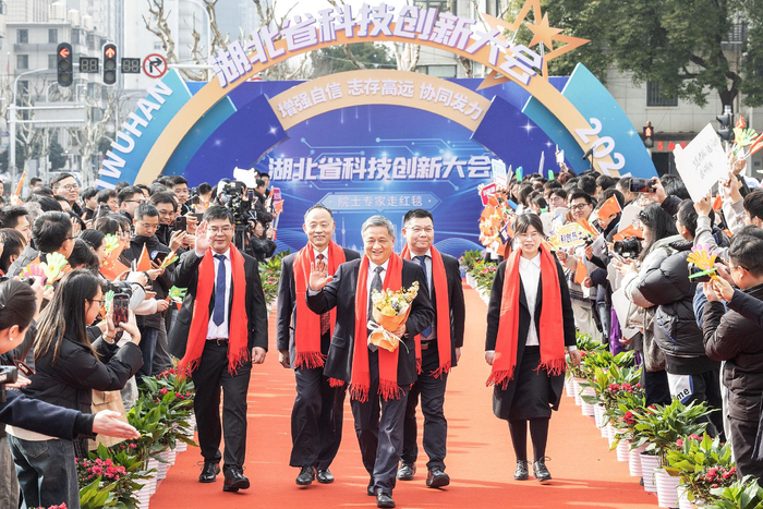 1月6日,湖北省科技创新大会在武汉洪山礼堂举行。图为中国工程院院士钮新强(中)和团队走红毯进入会场。 (湖北日报全媒记者 任勇 摄)