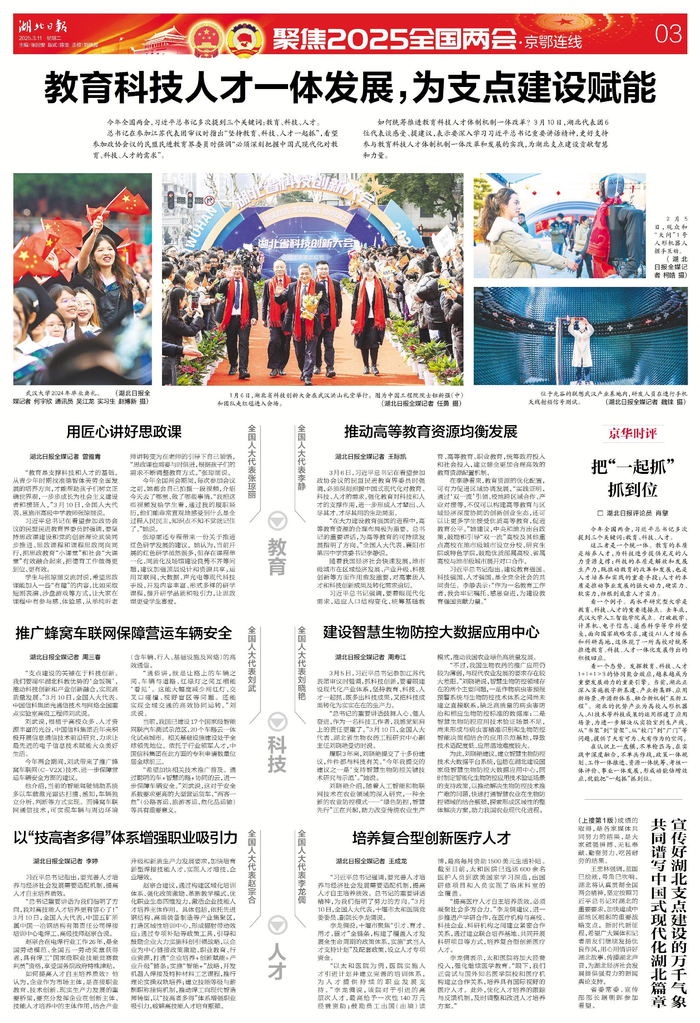 如何统筹推进教育科技人才体制机制一体改革?3月10日,湖北代表团6位代表谈感受、提建议,表示要深入学习习近平总书记重要讲话精神,更好支持参与教育科技人才体制机制一体改革和发展的实践,为湖北支点建设贡献智慧和力量。