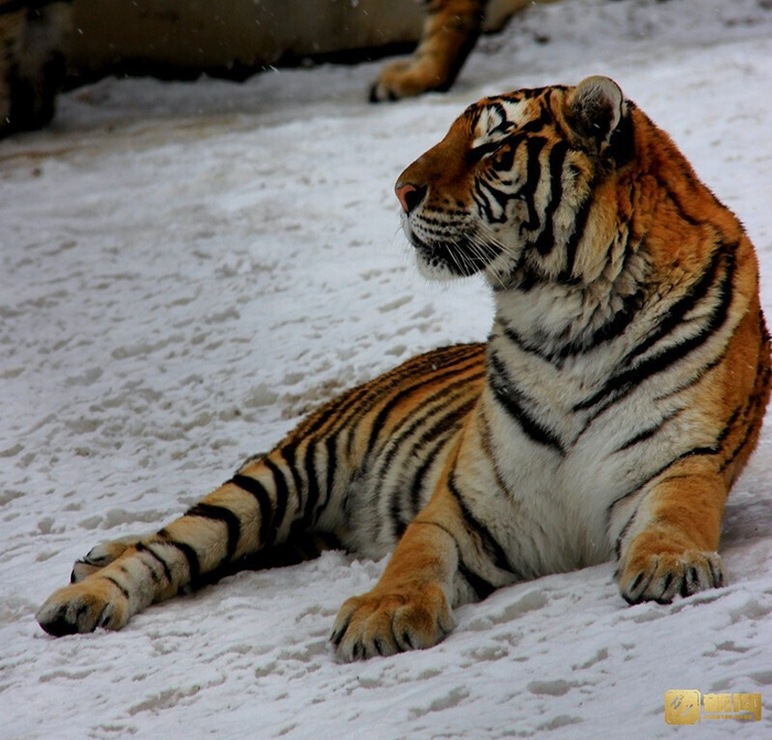 东北虎,又称西伯利亚虎,栖居于森林、灌木和野草丛生的地带。它们前额上的数条黑色横纹,极似“王”字,故有“丛林之王”的美称。“皑皑白雪,东北虎身披锦缎,特别威武。”虎园的工作人员说。
