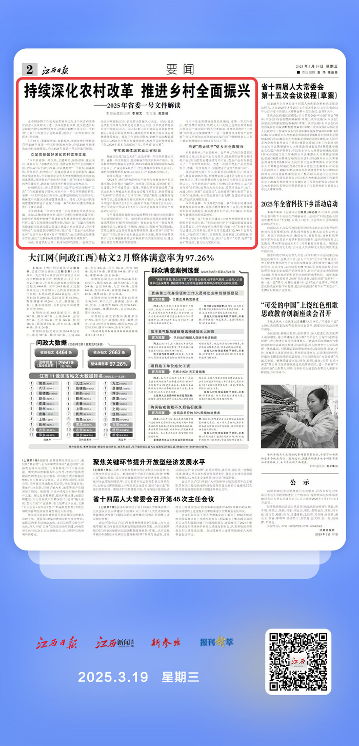 详见>>江西日报要闻版头条 | 持续深化农村改革 推进乡村全面振兴
