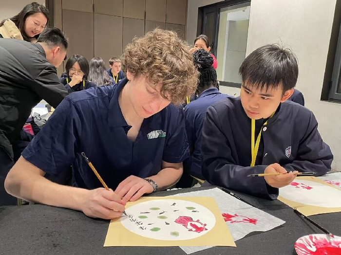 在中国传统文化特色体验课堂上,中美学生结对协作,不一会儿象征“平安顺遂”的中国结就初现雏形,成为美国小伙伴心中的“网红爆款”。美国中学生马修在完成自己的首个中国结作品后,还想再做一个带回美国送给他的妹妹,他笑着向身边的中国小伙伴说:“我的妹妹肯定很喜欢。”太极扇训练场里,美国小伙伴被中国功夫“圈粉”,他们挥扇生风,一招一式学得有模有样。书法和国画课堂中,中美学生在一撇一捺间感受汉字的结构之美,水墨丹青晕染出两国跨文化的艺术共鸣。