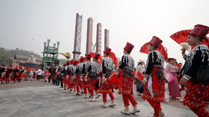 随着浑厚的铓鼓声响起,庆典拉开帷幕。“瑙双”“瑙巴”引领着众人步入目瑙纵歌场,围绕着目瑙示栋开始歌舞。不同民族的人们汇聚成一条舞动的长龙,青年男子挥舞长刀,少女们挥动手帕和彩扇,一同合着欢快节奏,顿步摆肩。大家通过共同的舞蹈动作,传递情感,增进了解与信任,友谊的种子在欢乐的氛围中生根发芽。