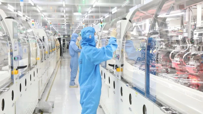 我现在是在蚌埠国显科技有限公司的生产车间,在我身边的就是一条用于生产笔记本电脑显示屏的产线,在经历技术改造后,这里的生产效率比原来提高了30%以上,同时,产品不良率和能耗也大幅降低。