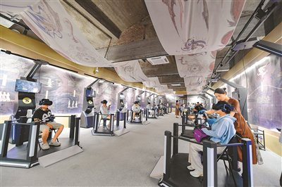 2024年7月22日,在甘肃省敦煌市,游客线下体验由敦煌研究院联合腾讯推出的深度文化知识互动项目“寻境敦煌——数字敦煌沉浸展”。新华社记者 郎兵兵摄