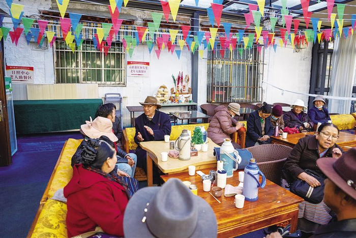“波啦,您来啦,快坐下来喝点热茶。”“莫啦,待会午饭在这边吃吗?”近日,记者来到拉萨市城关区蕃阳社会工作者和志愿者服务协会下的策门林老年日间照料中心,刚进大门就被一群正在锻炼身体的老人所吸引。他们跟着老师抬手、踢腿、扭腰,动作整齐划一,脸上洋溢着幸福的笑容。锻炼结束后,赤来回到助餐区,边喝甜茶边吃“卡赛”,和老人们分享趣闻,拉着家常,现场传来一阵阵欢声笑语。