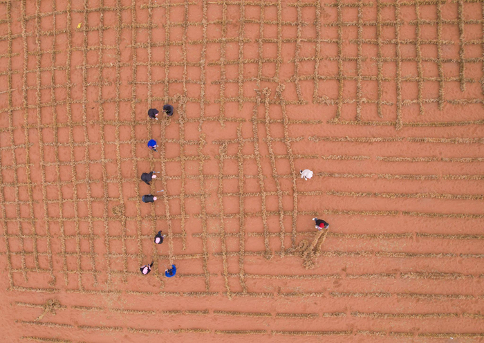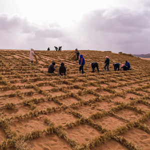 “今年采用刷状网绳式草方格沙障、机械扎草方格等新技术、新模式,既提高铺设草方格效率,又节省部分人力。”治沙专家唐希明望着一座被草方格覆盖了大半的沙丘介绍道。刷状网绳由滚筒式编织机将秸秆与绳子扭转成瓶刷状,依据风沙运动规律,直接铺设于沙地,无须压埋。拉绳、量间距、铺设、扭结……工人们几人一组默契配合,快速让一米见方的草格子牢牢固定流沙。中卫市腾格里沙漠宁夏南部生态保护修复与水土流失综合治理项目总投资10185万元,实施面积21.21万亩,目前,有12个工程标段同步建设。