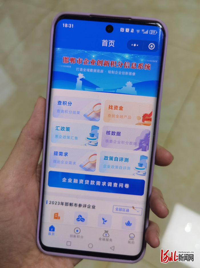 邯郸市为探索实施企业创新积分制开发的微信小程序“邯郸市企业创新积分信息系统”,为企业提供多元化科技金融服务。 河北日报记者 李冬云摄