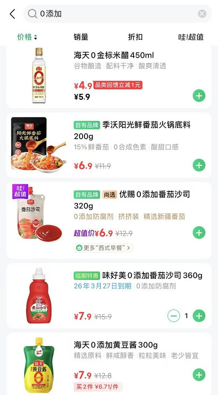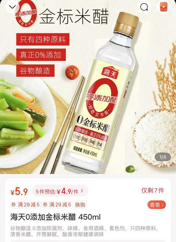 线上平台同样如此,在永辉生活APP上搜索“0添加”,能找到生抽、酸奶、蚝油、麦片等大量商品。一款海天金标米醋商品评价达3000多条,包装上印有“0”字样,标注零添加。商品介绍称,该米醋采用谷物酿造,0添加防腐剂、味精、食用酒精和着色剂,仅含四种原料。