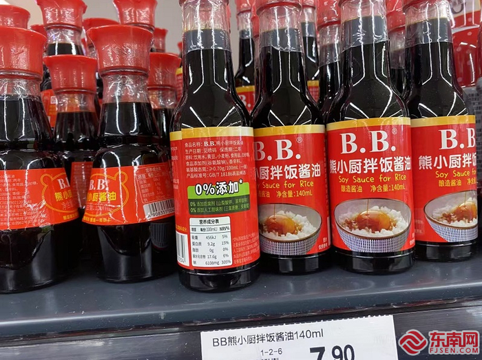 在永辉超市福州西门店记者看到,调料区货架上摆放在了显眼位置,包括料酒、生抽、酱油、蚝油等,导购员积极推荐“0添加”的商品。其中一款食品名称为B.B熊小厨拌饭酱油的包装醒目位置写着0%添加,并用文字说明:0%添加防腐剂(山梨酸钾、苯甲酸钠),0%添加人工甜味剂(三氯蔗糖、安赛蜜)。