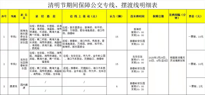为方便广大市民往返海口市殡仪馆、吉荫贤陵园、浮陵水公墓、颜春岭安乐园清明祭扫,4月3日至5日海口公交临时开通2条清明祭扫专线和1条清明祭扫摆渡线,同时加大原线路保障,全力确保清明节群众祭扫活动安全顺畅文明有序出行。
