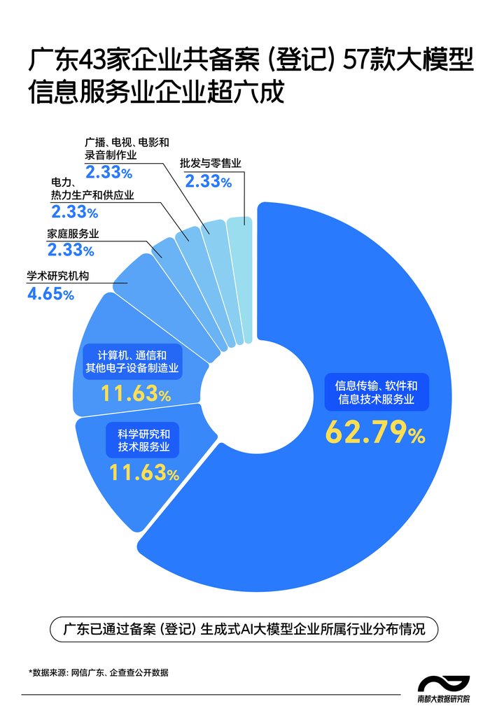 截至目前广东已有43家企业的大模型完成备案(登记)。从行业分布看,整体呈现多行业入局,个别行业聚集的特点。信息传输、软件和信息技术服务业占比约为63%,科学研究和技术服务业和计算机、通信和其他电子设备制造业企业分别超一成。
