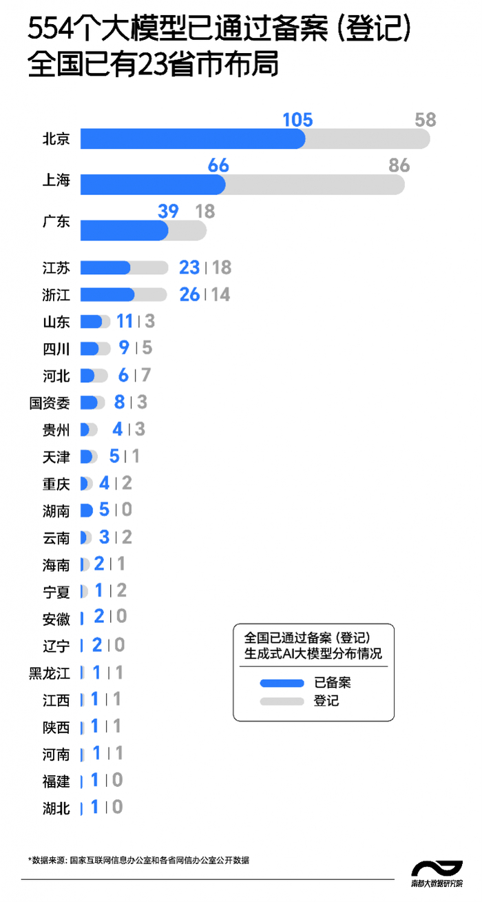 经南都大数据研究院统计,根据各地最新通告,截至2025年3月19日,我国已有327个生成式AI大模型通过备案、227个生成式AI大模型完成登记。从地域布局来看,全国共有23个省份已经在备案上有所布局,其中北京、上海和广东分别通过105、66、39个大模型备案。