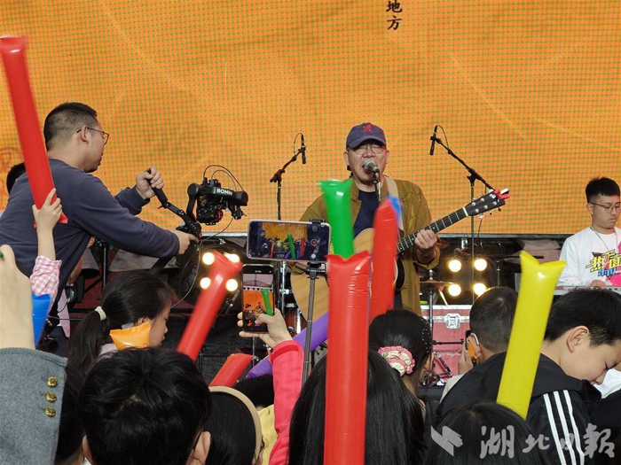 “冬天腊梅花,夏天石榴花。晴天都是人,雨天都是伢。”4月4日,武汉本土歌手冯翔来到武汉东湖樱花园,在樱花树下唱起《汉阳门花园》。“樱花季的武汉太浪漫了,英雄的城市一路繁花。”来自宁夏的游客许女士和儿子站在舞台边,跟着音乐一起摇摆。舞台上,冯翔还和观众进行答题互动,现场教学武汉话,引起掌声连连。