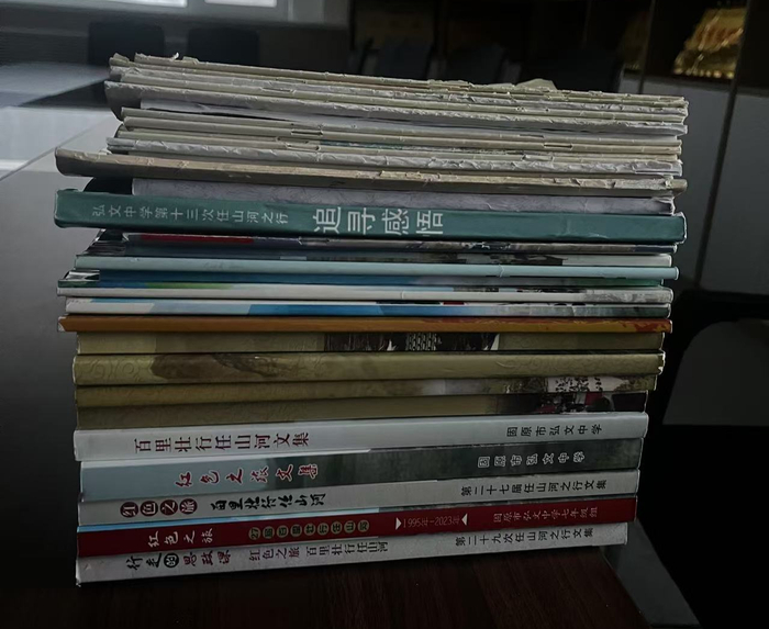 “徒步百里祭英烈”是坚持了30年的事情,写活动感想同样也是坚持了30年的重要环节。每次返校后,学校都会组织学生撰写心得体会,并将其编撰成册。从《海燕》《潇洒走一回》《成长的足迹》到《百里壮行任山河》《红色之旅》《行走的思政课》,这些作文集记录了每一位学子徒步任山河之后的感想,垒起来能有小臂那么高。即使是第一届参与徒步的学生,如今回到学校依然能找到当年自己写下的感想。