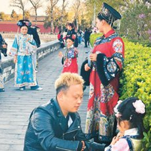 这样的场景在王府世纪全天上演。38岁的济南教师张女士带着丈夫和女儿体验“皇家套餐”——女儿戴着小旗头扮“小格格”,她穿皇后常服,丈夫套上绣金龙的“皇袍”,一家三口在故宫太和殿前拍摄全家福。“回头率特别高。”张女士说。