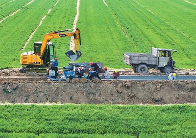 江苏省宿迁市泗洪县大楼街道周庄社区高标准农田改造提升现场,工人正修筑防渗渠。张连华摄(人民图片)