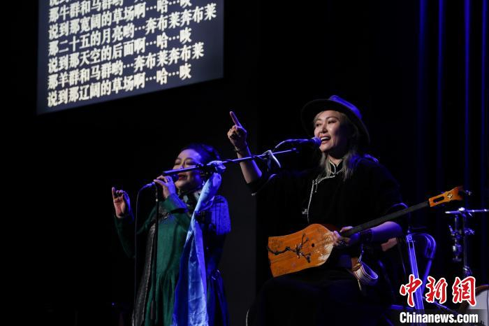 当地时间4月8日,加拿大大多伦多地区万锦市(Markham),来自中国内蒙古自治区的民族音乐团体安达组合为当地观众演出。 图为乐队成员赛汗尼亚(右)、其其格玛在演出中与观众互动。 中新社记者 余瑞冬