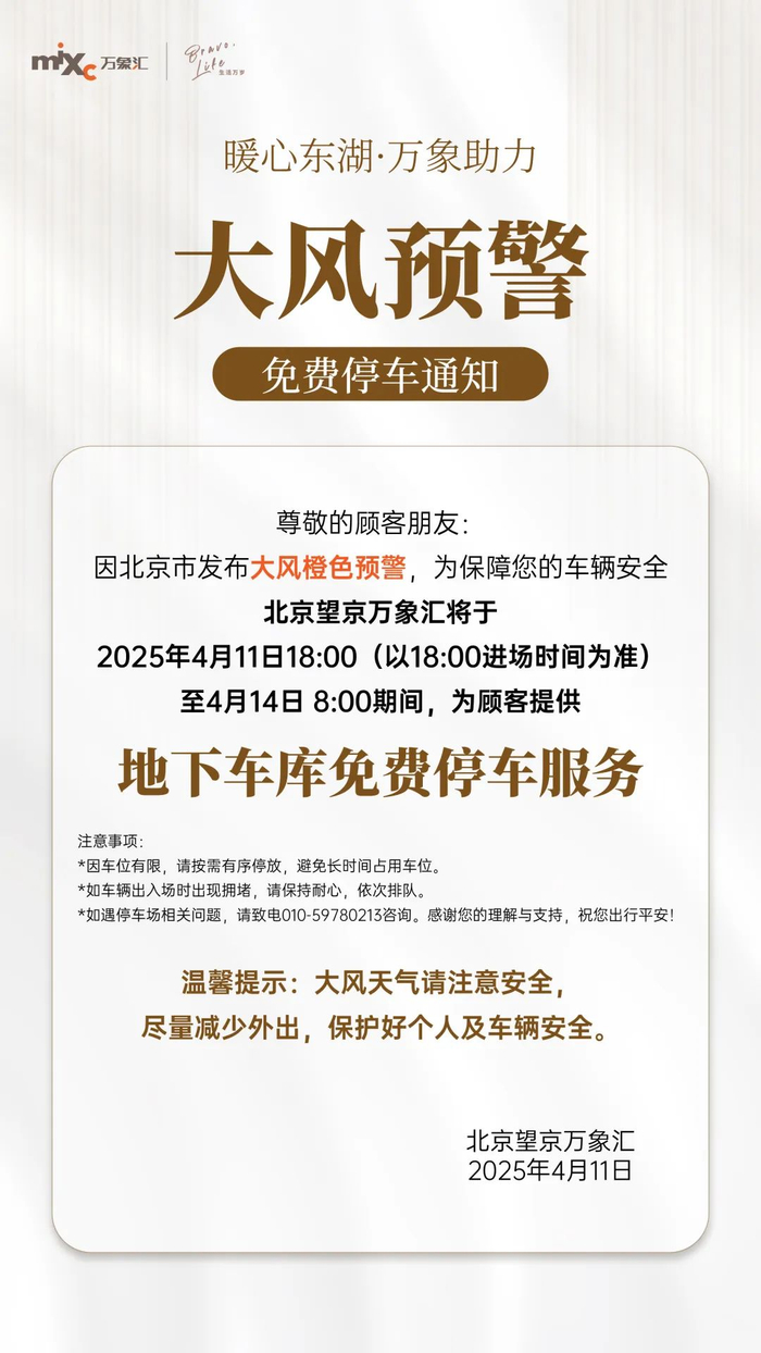每逢周末,小区周边本就停车难;极端大风天,停在路边的车辆面临树木倒伏、广告牌跌落等风险,更让车主担心。4月12日清晨,什刹海街道一棵大树被大风吹倒,导致多辆机动车受损。截至4月12日10点,树木倒伏已造成压车19辆。北京车辆众多,极端大风天市民安全停车需求大增,商场在此时伸出援手,可解市民燃眉之急。据报道,望京万象汇、京广中心商务楼、朝阳合生汇、京西大悦城、安河桥华联等商场园区接连公布免费停车服务信息;丰台区则协调相关企业于4月12日8时至14日8时免费提供桥下空间停车服务,保障市民车辆安全。11日晚,“北京朝阳”微信公众号还发起接力,倡导各单位最大限度开放地下停车场、闲置车位等资源,为周边居民提供临时避险停车服务。