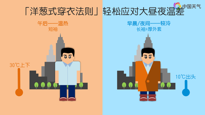 未来三天,我国大部地区最高气温一路上升,但北方多地昼夜温差较大,特别是西北、华北局地接近20℃,短袖出场的时间仅限于午后,一日过两季,洋葱式穿衣法可助你灵活应对任性气温。