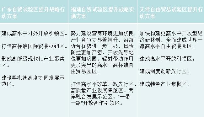 2023—2024年,福建、广东、天津自贸试验区先后印发提升行动方案及配套文件,在扩大制度型开放、营造一流营商环境、加强联动创新发展等方面出台具体措施,并分别围绕自身区位优势,结合特色产业,提升辐射带动和服务国家战略的能力。