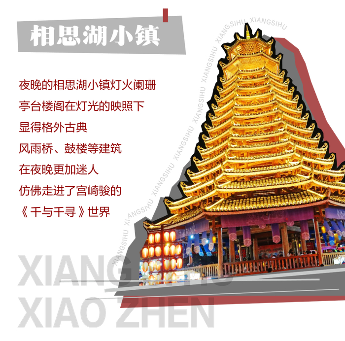 小镇内有多家汉服租赁店,提供多种款式选择。游客可以租一套心仪的汉服或侗族服饰,在相思鼓楼前、风雨桥下等景点拍照留念。夜晚是拍摄的最佳时段,因为那时相思鼓楼、风雨桥会亮灯,营造出浓厚的古风氛围。
