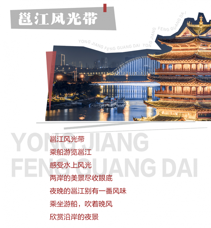 沿途景观:畅游阁、冬泳亭、邕江大桥、邕江宾馆、古城墙、壮族神话浮雕、桃源桥、壮景文化秀、大堤灯光秀、凌铁大桥、洋关码头、白沙大桥、邕州老街、雷经天故居等。