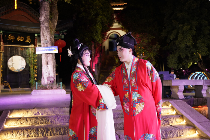 这出戏是武汉楚剧院的国风环境式新编楚剧《又从西厢过》。“这是我第一次看楚剧,没想到楚剧这么有趣!”来自河南的游客张女士说。演出中,她还主动举手“入戏”,为主角张生和崔莺莺的婚礼献上才艺表演。