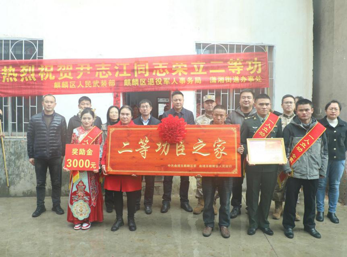 曲靖市麒麟区在现役军人婚礼现场送上“二等功臣之家”牌匾、奖励金和喜报。